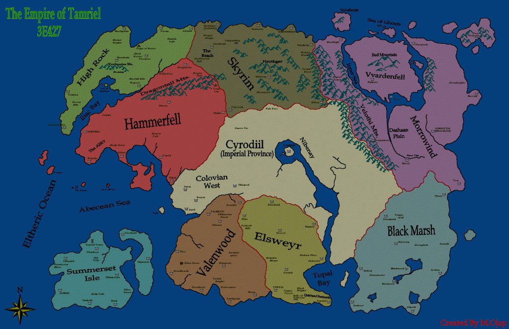 Skyrim это уже пятая ролевая игра из эпичной серии TES от Bethesda. Для незнакомых с серией, напомню что дело происходит на планете Нирн c основным континентом Тамриэль с множеством животных, рас, языков; во время, по духу очень напоминающему распад Римской империи и начало раннего средневековья. Но прежде, немного космологии..