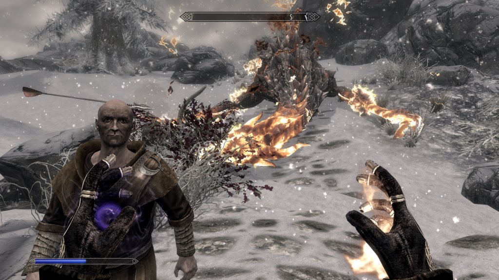 Начав заново и прокачав мага, я смог добиться громадного урона. Во первых у меня телохранитель с heavy-armor и поглощающим здоровье топором. Во-вторых я призываю огненных атронафтов как бесплатные fireball-пушки. В третьих, из ключевых квестов ко мне присоединились персонажи и вместо того что-бы продолжить этот квест и отпустить их, я гуляю по миру вместе с ними как с бессмертными компаньонами. В итоге я хожу не один, а вшестером и уже смог завалить одновременно нападающих двух драконов с мамонтом и гигантом впридачу.