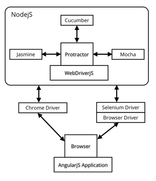 Protractor — движок для запуска системных (end-to-end, браузерных) тестов. Внутри он использует selenium с драйверами для браузера (chromedriver), а сами тесты пишутся с синтаксисом jasmine. Про него и карму я уже писал, впрочем mocha и cucumber тоже поддерживаются.