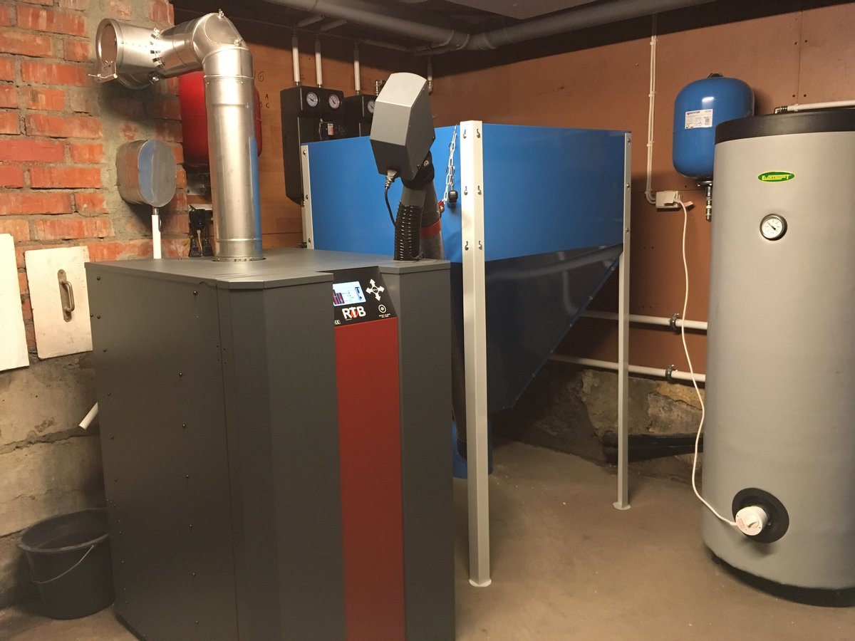 Выбрал я в итоге пеллетный котёл от датской NBE, RTB30 (30квт). Степень сгорания более 91%, что значит что для смены бака надо сжечь порядка тонны пеллетов (т.е. менять золу надо будет раз в пару месяцев)