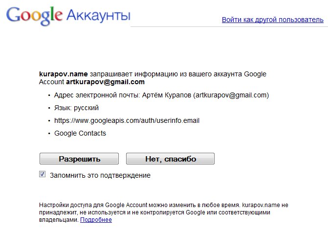 - Основная часть - если ключа доступа нет - запрашиваем ключ запроса с указанными двумя услугами (scope). Первый даст доступ к контактам а второй - к почте. Если же клиент уже подтвердил запрос и ключ доступа мы имеем (или получили из сессии/БД), то делаем два http-запроса.