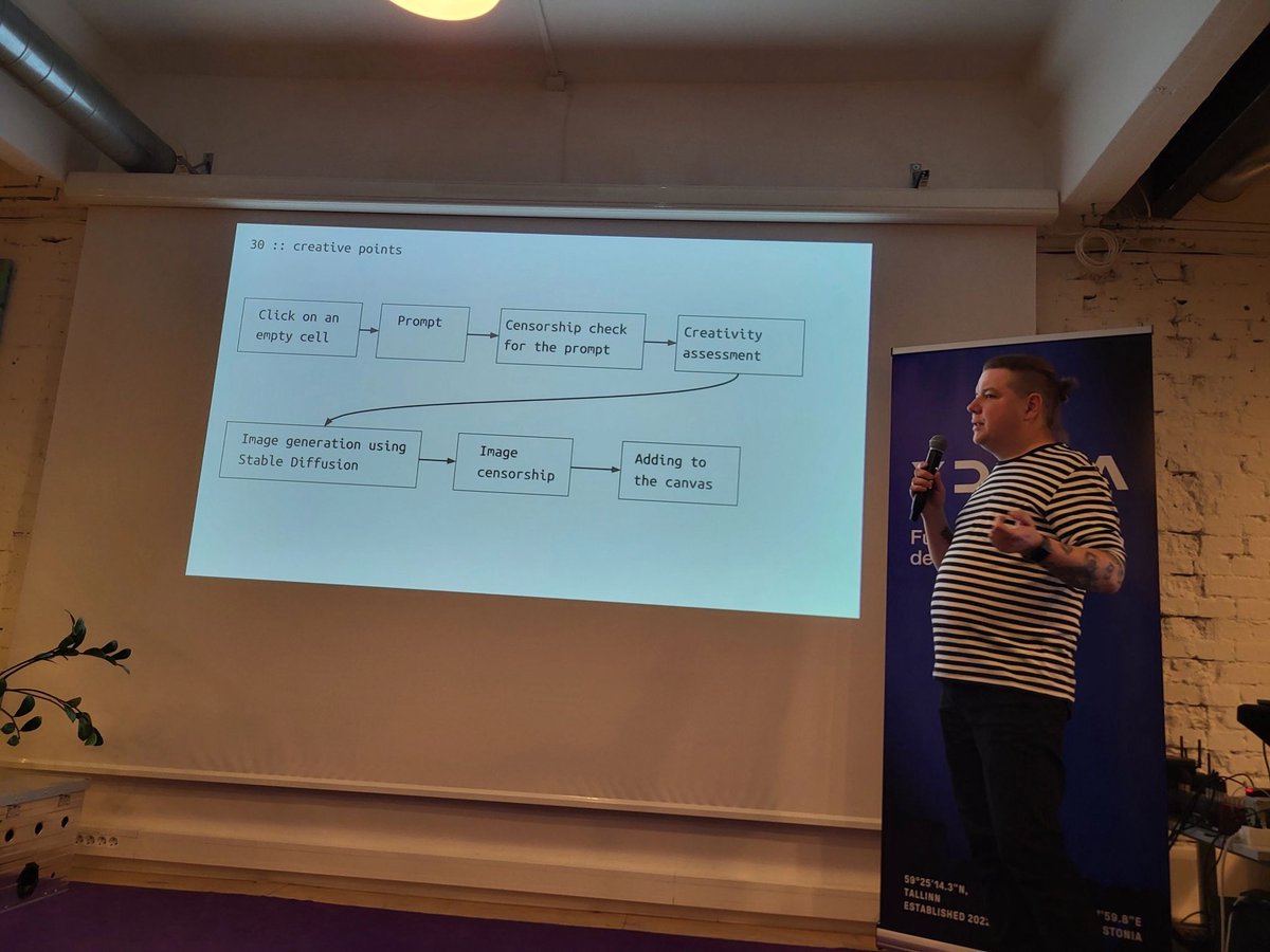 Second talk was by Mikhail Dunaev on https://www.hexagen.world/ . An infinite canvas project with hexagonal ai-generated tiles that make up a cool map that over 8 thousand users tried out. Most of it coded also using cursor, making author 2x more efficient, shifting work into more product-oriented thinking.