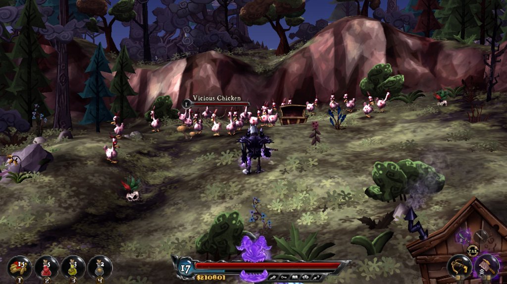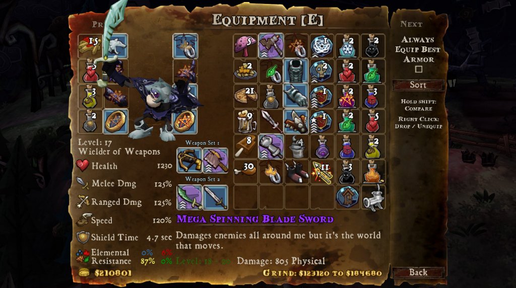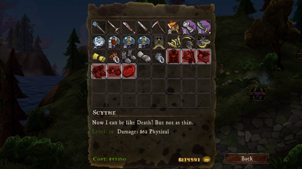 Ещё насчёт механики - битва очень простая - можно расстреливать издалека арбалетом (в том числе и с магическими стрелами), либо вплотную рубить мечом. Некоторое оружие с фиолетовым фоном - оно даёт прирост ярости, которое по достижению уровня можно израсходовать на сильный удар. Ещё есть защита с сопротивлениями к разным типам магий, есть зелья для лечения, защиты..