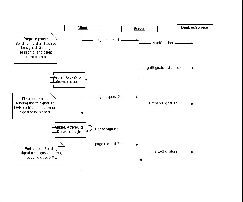 Создание сессии между приложением и digidoc (StartSession) с передачей инфы о контейнере (который может включать несколько подписываемых файлов) — либо целиком файлы, либо их SHA1-хэш. Запоминаем вернувшися SessionCode у себя