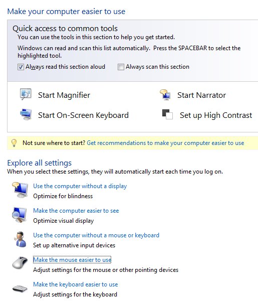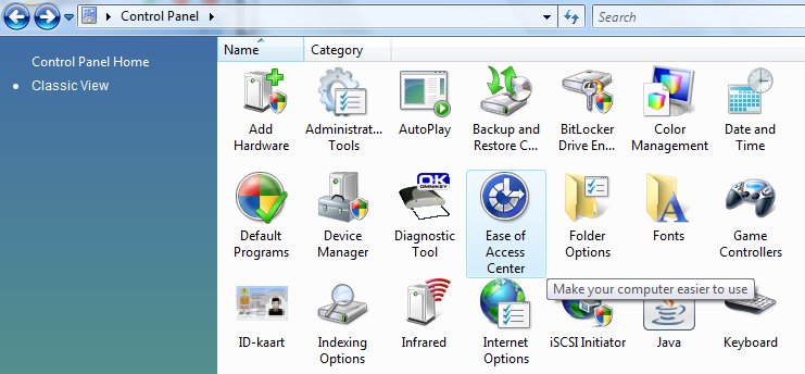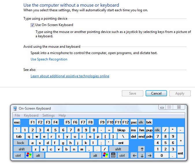 Жизнь без клавиатуры так же проблематичная и вероятна - пролитые на неё жидкости закорачивают контакты и если сразу сходить в магазин нет возможности, то виртуальная клавиатура временно спасёт положение. Включается она там же, Control Panel / Easy of Access / Use the computer without a mouse or keyboard. Она не забирает фокус с активного окна и элемента